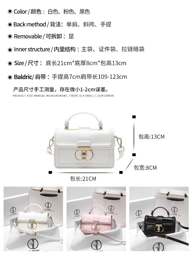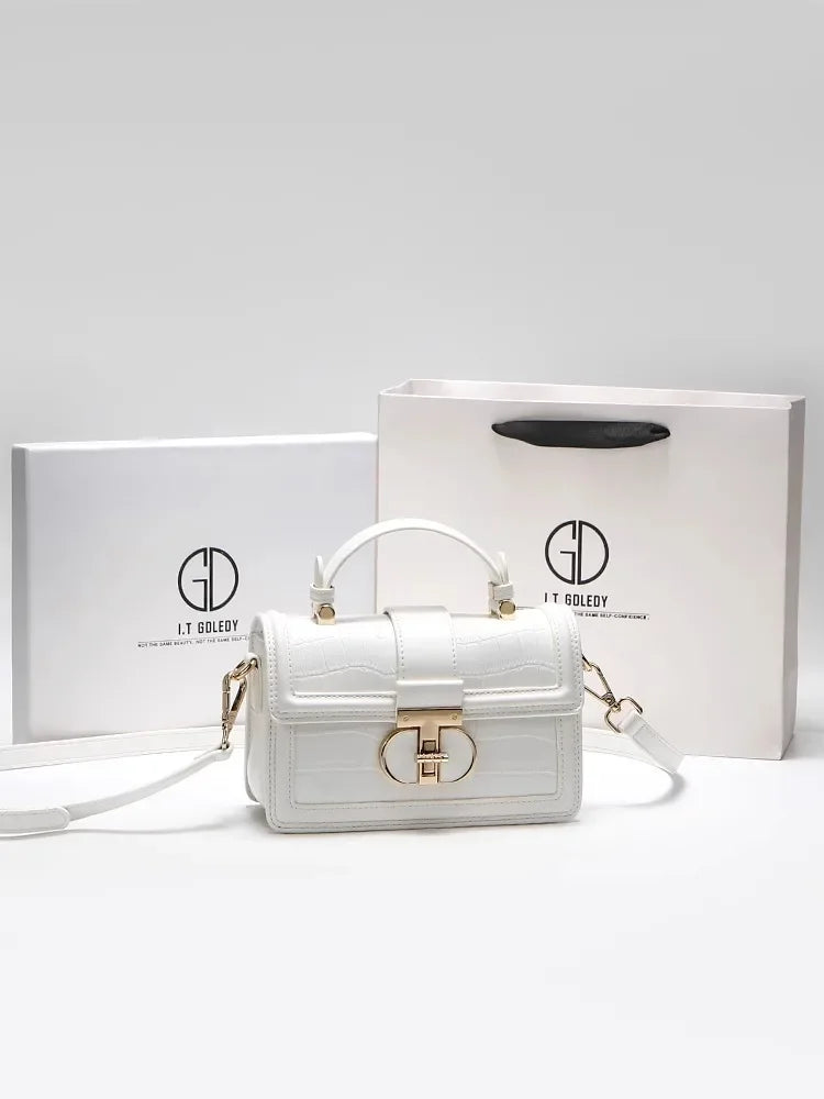 Its square shape and firm construction reflect confident, fashion-forward design, while the elegant press-lock closure adds practical functionality without compromising sophistication.